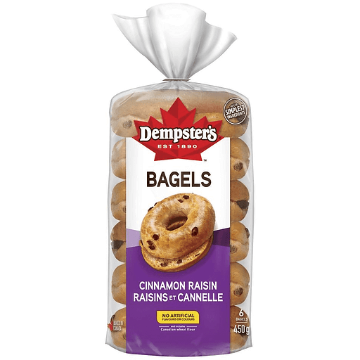 Dempsters Bagels Cinnamon RaisinDempster’s® Cinnamon Raisin Bagels contain no artificial flavours or colours. Perfect for toasting, they’re crispy on the outside, soft and fluffy on the inside and pre-sliced for on-the-go snacking.