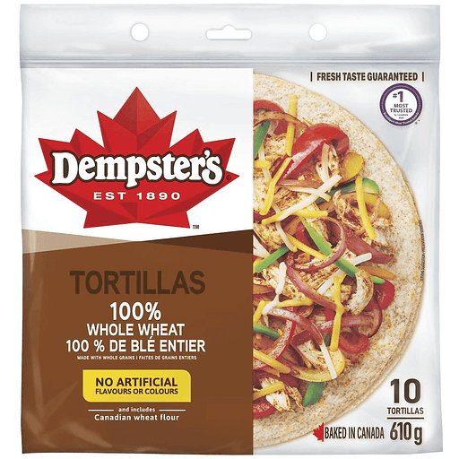 Dempsters Tortillas 100% Whole WheatDempster's® 100% Whole Wheat Tortillas are great for wraps, enchiladas, burritos and more. The large soft tortillas are made with whole grain whole-wheat flour and contain no artificial flavours or colours.