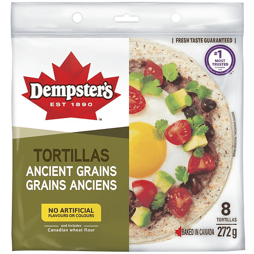 Dempsters Tortillas Ancient GrainsDempster's® Ancient Grains Tortillas let you wrap, roll or bake a wide variety of tasty recipes. These soft medium-sized tortillas are made with Canadian wheat flour and contain no artificial flavours or colours.
