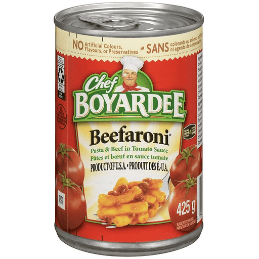 Chef Boyardee Beefaroni is a delicious and convenient prepared meal that is ready to eat in minutes and has delighted families for generations. Made with enriched pasta smothered in rich, Italian-flavored tomato and meat pasta sauce, this canned food has the timeless flavor everyone loves. Made with no artificial flavors, colors or preservatives, this iconic pantry staple makes a wholesome meal for kids of ALL ages. When you need a quick stove top or microwave meal, grab a can of Beefaroni and in just a few minutes, dinner is ready to serve. Perfect for office or school lunches, easy dinners, or quick and filling snacks, Chef Boyardee pasta provides that time-tested taste your family loves.