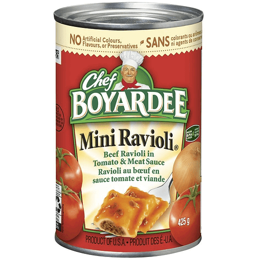 Chef Boyardee Mini Ravioli is a delicious and convenient prepared meal that is ready to eat in minutes and has delighted families for generations. Made with tasty beef ravioli pasta smothered in rich, Italian-flavored pasta sauce, this canned food has the timeless flavor everyone loves in a fun, bite-sized package. Made with no artificial flavors, colors or preservatives, this iconic pantry staple makes a wholesome meal for kids of ALL ages. When you need a quick stove top or microwave meal, grab a can of beef ravioli pasta and in just a few minutes, dinner is ready to serve. Perfect for office or school lunches, easy dinners, or quick and filling snacks, Chef Boyardee ravioli provides that time-tested taste your family loves.