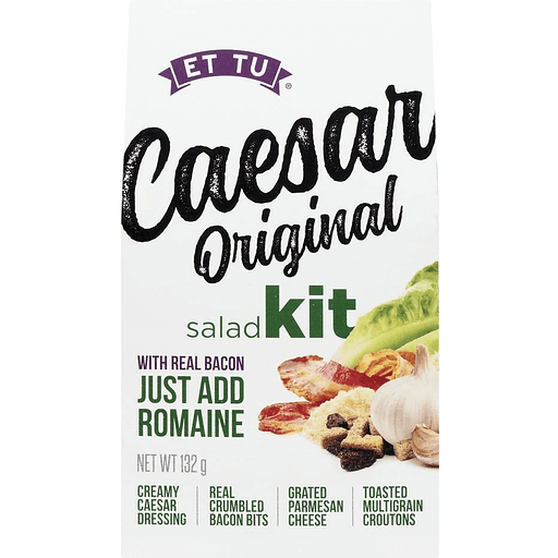 Kit makes up to 6 side salads. Salad Kid Includes: creamy Caesar dressing; bacon flavored bits; grated parmesan cheese; multi-grain croutons. Just add fresh romaine. What you'll find in this Et Tu Caesar Original salad kit: creamy Caesar dressing; bacon flavored bits; grated parmesan cheese; crunchy multi-grain croutons. Et Tu: your solution for creating a restaurant-quality Caesar salad. This salad kit makes 2 large dinner salad or up to 6 side salads. Perfect for family dinners entertaining, pot lucks or picnics. To complete a dinner salad, add your favorite protein: grilled or baked chicken, steak, pork tenderloin, fish or seafood. From the restaurant table to locations around the world! ET TU Salad Kits were first created for restaurant patrons who requested ingredients for our famous Caesar salad to take home and serve to family and friends. Since 1989 Linsey Foods has sold millions of Et Tu Salad Kits here at home and around the world. Our loyal customers have come to rely on the gourmet ingredients, all separately pouched to protect flavor and freshness. By adding fresh lettuce, you get a consistent restaurant-quality salad every time. But don't take our word for it - try one yourself. We promise - you'll love it. Superb salads. Simply made. Est. 1989. Nutritional values are for salad kid contents only and do not include lettuce. Partially produced with genetic engineering. Comments: 1-800-265-7836 or visit us at: www.ettu.com. Recyclable. Product of Canada.