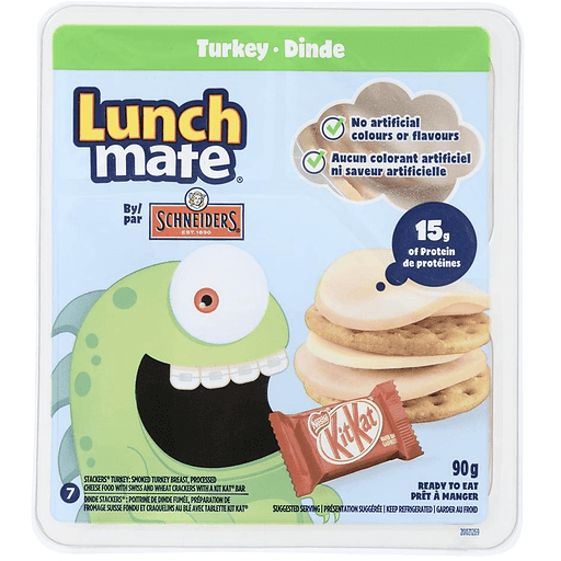 Great for a quick lunch at school or home, Schneiders® Lunch Mate® Turkey lunch kit lets kids build and stack their own ready-to-eat lunch. This snack kit features slices of turkey breast, swiss cheese, wheat crackers, and a bite-size Nestle Kit Kat® bar for dessert. Each turkey and cheese lunch kit delivers 15 grams of protein and is made with no artificial colours or flavours. These delicious and convenient kits for kids are ideal for school, sports practice, picnics, or on-the-go snacks. Since 1890, Schneiders Foods has established a rich heritage of original and authentic recipes, using premium ingredients and taking all the time needed to honour the origin and inspiration of each recipe. Quality never gets old™.