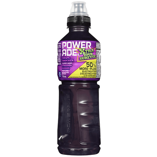 Powerade Xtra Sour Sports Drink Grape Shocker FlavourPOWERADE SOUR GRAPE SHOCKERPrice online does not include bottle deposit. Bottle deposits will be added to your order.