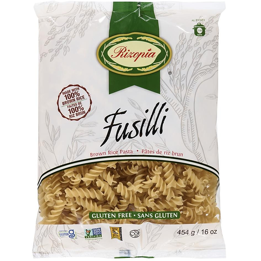 100% rice pasta. Gluten-free/wheat-free. Low-fat. Trans-fat-free. Low-saturated-fat. Sodium-free. Cholesterol-free. Source of fiber easy to digest. Manufactured in a gluten-free and nut-free factory premise. Proudly made in Canada with quality U.S. grown brown rice.