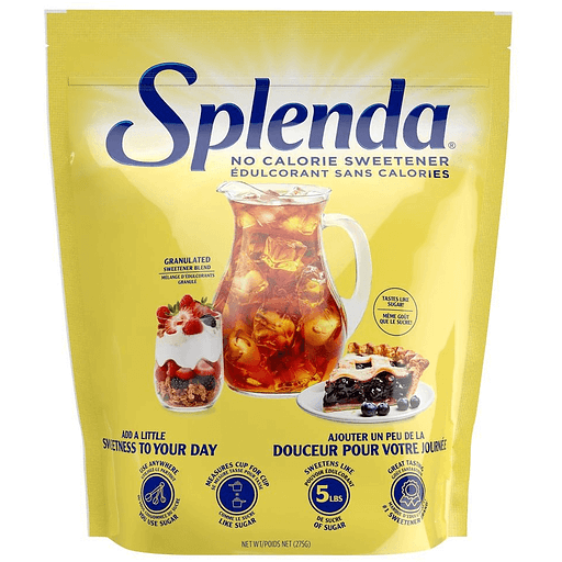 With sucralose. Tastes like sugar. Sweetens like 5 lbs (2.3 kg) of sugar. Resealable. Proud support of the Canadian Diabetes Association. diabetes.ca/proudsupporter. Ideal for the whole family. Splenda No Calorie Sweetener, Granulated can be used to sweeten almost everything including beverages, cakes, pies and muffins. For more great recipes and tips on baking and cooking with Splenda Products, visit www.splenda.ca. Sweet swaps. Sucralose Content: 6 mg per 0.5 g. Each 1 tsp (0.5 g) sweetens like 1 tsp (5 ml) of sugar. Suitable for people with diabetes. To get delicious recipes, baking tips and more: Splenda.ca; Facebook: facebook.com/SplendaCanada; 1-800-561-0070. Made in USA.