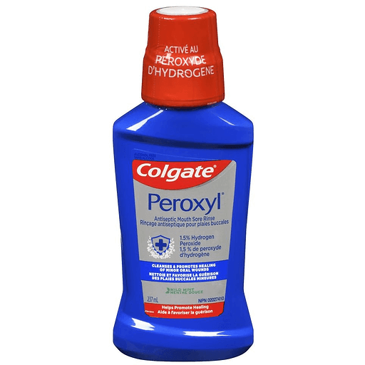 Colgate® Peroxyl® Mouth Sore Rinse. 1.5% hydrogen peroxide antiseptic oral cleanser & rinse. Cleans & promotes healing of minor mouth wounds. Reduces bacteria to help prevent infection in minor oral wounds. Oxygenating action removes oral debris to facilitate healing. Original Mint.