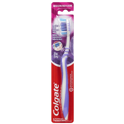 Colgate ZigZag Toothbrush is a medium toothbrush designed with v-shaped cross bristles to reach deep between teeth for an effective clean that reaches the right places. This toothbrush also has a soft tongue cleaner that gently removes odor causing bacteria from your tongue and cheeks. Not only comfortable to allow more control during your brushing routine, the Colgate ZigZag Toothbrush is also responsibly made.* Made in a zero true waste, LEED-certified facility, the ZigZag toothbrush features a 25% recycled plastic toothbrush handle and a 1% recycled paperboard backercard. These deep clean toothbrushes come in different colors for multiple people in a household or for a replenishment. Remember to change your toothbrush every 3 months.