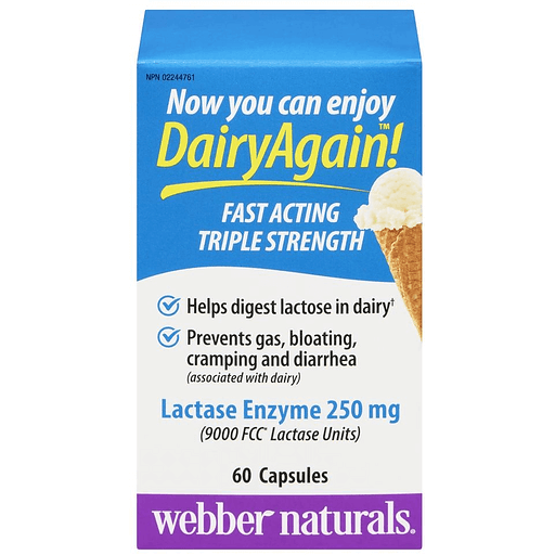 Webber Naturals Dairy Again Lactase Enzyme 250Mg Fast Acting Triple StrengthDAIRY AGAIN LACTASE ENZYME 250