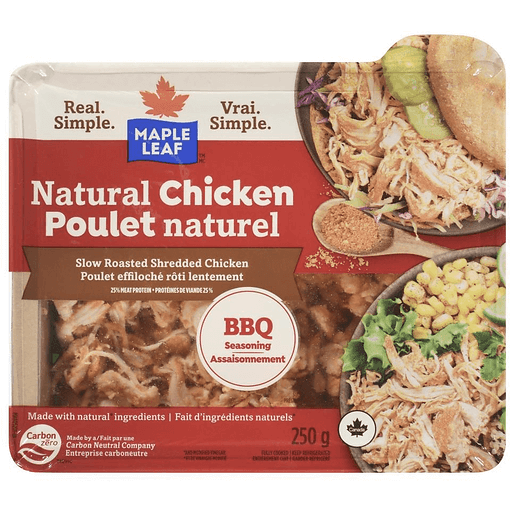 Maple Leaf® Natural BBQ Shredded Chicken is a simple and delicious addition to salads, grain bowls, and much more. Pre-cooked and flavoured with BBQ seasoning, this slow-roasted shredded chicken takes all the prep work out of adding protein to a healthy lunch, dinner, or snack. Maple Leaf® brand meats are made with natural ingredients. Dedicated to providing wholesome, real food for Canadians for generations to come, Maple Leaf® is the first major food company in the world to become carbon neutral. Join them in their commitment to build a more sustainable planet.