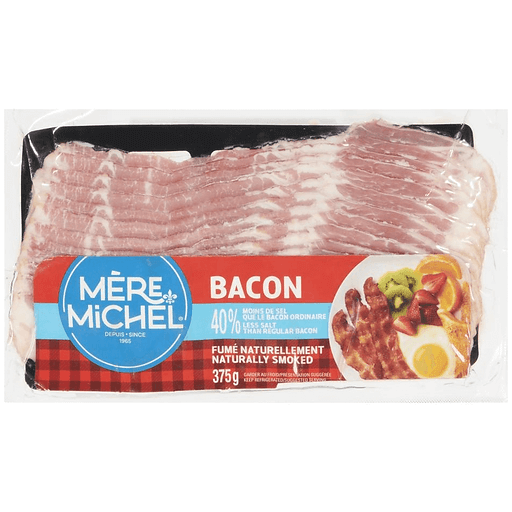 Experience hearty smoked bacon with Mère Michel® Less Salt Bacon. Crafted from quality cuts of pork, these delicious bacon slices are naturally smoked to ensure rich flavour. This low-salt bacon offers the same delicious flavour as Mère Michel® Original Bacon, but with 40 percent less salt. Try this sliced bacon in your favourite breakfast dishes, sandwiches, and salads. As a Maple Leaf Foods brand, Mère Michel® is proud to be a part of feeding millions of Canadians, every single day.