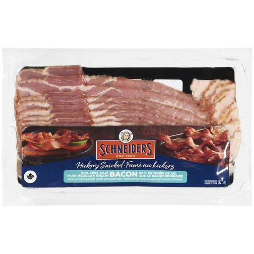Enjoy delicious hickory smoked bacon with less salt with Schneiders® Hickory Smoked 50% Less Salt Bacon. These savoury bacon slices are crafted from premium cuts of pork and naturally slow smoked with an open flame in North American hickory for rich, smoky flavour. With 50 percent less salt than regular bacon, this low sodium bacon is a tasty addition to breakfast dishes, sandwiches, and salads. Since 1890, Schneiders Foods has established a rich heritage of original and authentic recipes, using premium ingredients and taking all the time needed to honour the origin and inspiration of each recipe. Quality never gets old™.