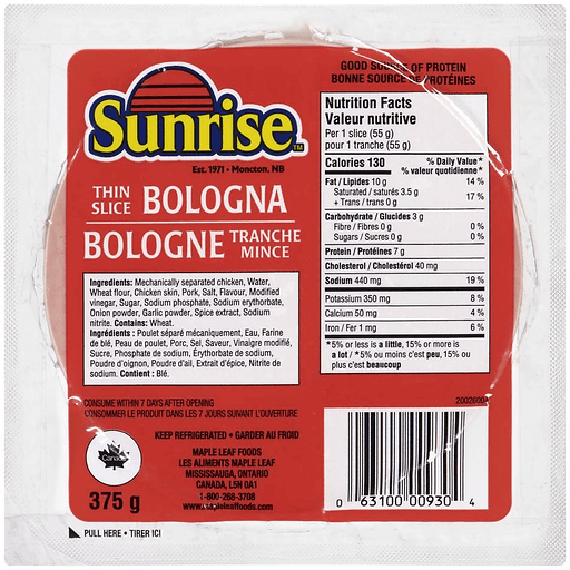 Create a tasty sandwich with Sunrise® Thin Sliced Bologna. Made in Canada, this thinly sliced bologna is crafted from premium cuts of meat that have been finely ground and seasoned with a blend of spices that give the meat its distinctive taste and texture. A good source of protein, these thin slices of sandwich meat offer delicious flavour that both kids and grown-ups enjoy. The convenient, easy-to-open package ensures the deli meat stays fresh and ready to enjoy anytime. Since 1971, Sunrise® brand has been proud to help feed and nourish Canadian families, every single day.