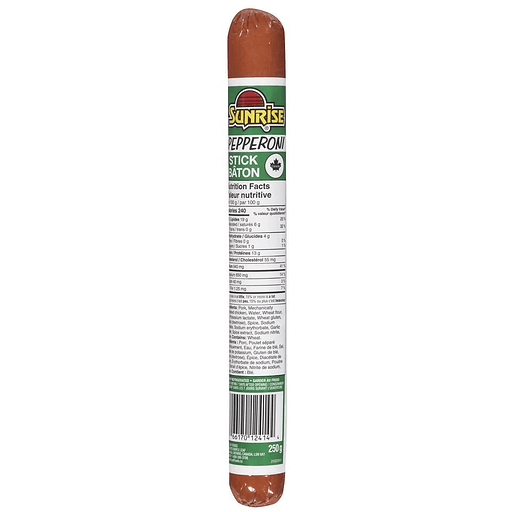 Experience delicious flavour in a portable snack with a Sunrise® Pepperoni Stick. Made with premium cuts of meat, this meat snack stick has been smoked and seasoned with traditional pepperoni flavouring. A good source of protein, the pepperoni sticks are satisfying fuel during a strenuous hike or a tasty afternoon snack. Since 1971, Sunrise® brand has been proud to help feed and nourish Canadian families, every single day.