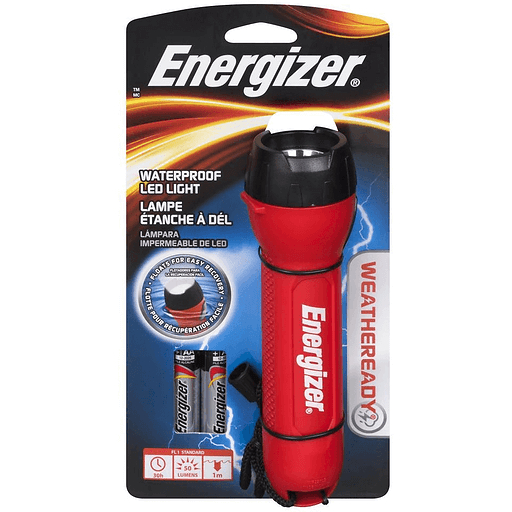 Energizer Weatheready Light Led35h runtime. Floats. IPX7. 2 AA alkaline batteries. Reflective panel. FL1 Standard: 55 lumens; 35h; 1m; 50m; IPX7.