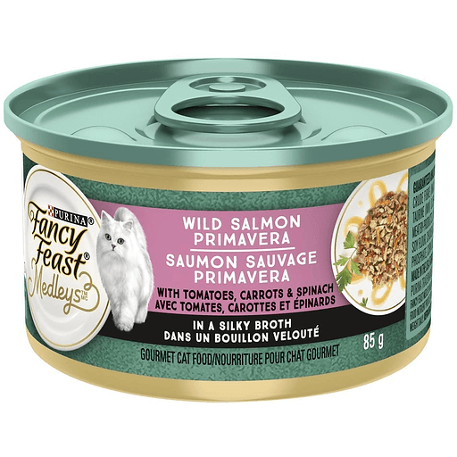 Fancy Feast Medleys™ Wild Salmon Primavera with Tomatoes, Carrots & Spinach in a Silky Broth gourmet cat food recipe uses exceptional ingredients to create delicious combinations inspired by dishes throughout the world. Fancy Feast Medleys canned cat food has essential vitamins and minerals to support your cat’s health and wellness. Watch your cat scamper toward the sound of the can opening whenever you serve this high-quality cat food!