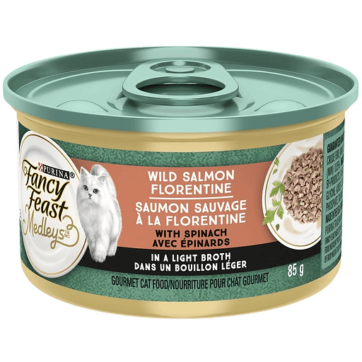 Fancy Feast Medleys™ Wild Salmon Florentine with Spinach in a Light Broth gourmet cat food recipe uses exceptional ingredients to create delicious combinations inspired by dishes throughout the world. Fancy Feast Medleys canned cat food has essential vitamins and minerals to support your cat’s health and wellness. Watch your cat scamper toward the sound of the can opening whenever you serve this high-quality cat food!