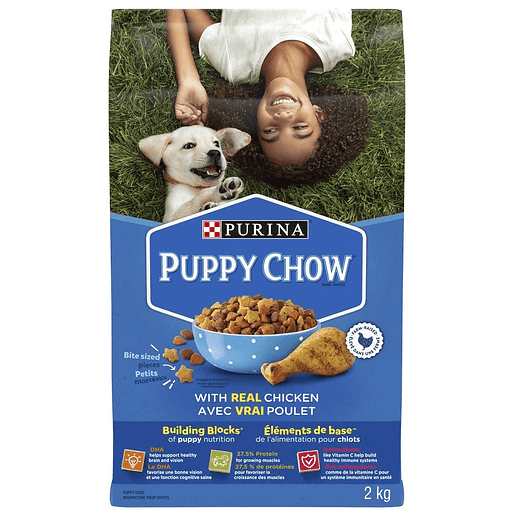 Provide the nutrition your puppy needs to get a great start in life with Purina Puppy Chow Complete With Real Chicken, dry puppy food. Every serving of this puppy food contains 100 percent of the essential nutrients puppies require to grow big and strong, and the delicious taste gives them a reason to clean their bowl at every feeding. Tend to your growing pup's nutritional needs through the vital early stages of their development with this dry puppy food and take comfort in knowing they’re getting a highly digestible formula your puppy will look forward to eating every day. This recipe supports your puppy’s growing muscles, so they can keep up with their adventurous canine pursuits. Dish up a serving of this Purina Puppy Chow puppy formula and let them know you care about their health and happiness. Purina Puppy Chow Complete puppy food provides the Building Blocks of puppy nutrition to help lay the foundation for a healthy, active life. The Healthy Start blend provides high-quality protein, including real farm raised chicken, DHA for brain and vision development, antioxidants like vitamin C, and 100 percent of the essential nutrients for your puppy’s first year.