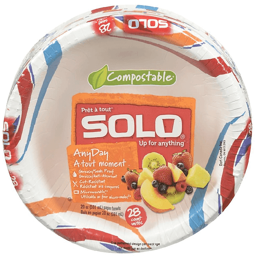 591 ml. Grease/Soak proof. Cut-resistant. Microwavable (Microwave usage: limited re-heating of food only. Caution - check plate before removing from oven). Commercially compostable (Compostable only in commercial composting facilities, which may not exist in your area. Not suitable for backyard composting). One patterned design per package. Up for anything. Solo Paper Bowls Are: strong and stylish to serve any occasion; soak and grease proof; cut-resistant; microwavable (Microwave usage: limited re-heating of food only. Caution - check plate before removing from oven); compostable (Compostable only in commercial composting facilities, which may not exist in your area. Not suitable for backyard composting). Look for other coordinating Solo products to complete the set! Visit us at: www.solocup.com. Questions? 1-877-Solonow.