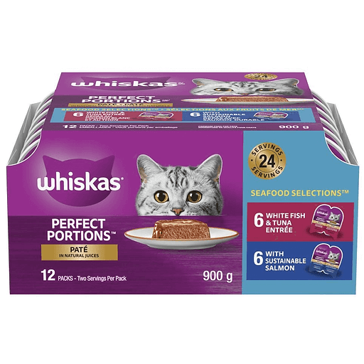 Calorie Content (Calculated): 941 kcal ME/kg, 35 kcal ME/serving. Whiskas Perfect Portions Pate Salmon Entree is formulated to meet the nutritional levels established by the AAFCO Cat Food Nutrient Profiles for all life stages. Calorie Content (Calculated): 1010 kcal ME/kg, 38 kcal ME/serving. Whiskas Perfect Portions Pate White Fish & Tuna Entree is formulated to meet the nutritional levels established by the AAFCO Cat Food Nutrient Profiles for all life stages.