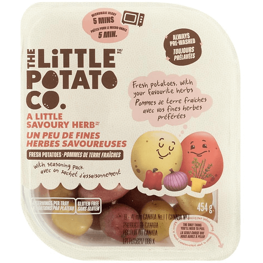 Fresh creamer potatoes with seasoning pack. A tantalizing blend of savory herbs and spices. No artificial colors or flavors. 80 calories (114 g serving) Gluten free. Vegan. source of potassium. This tray holds 3 cups of vegetables, contains fibre and 5 essential nutrients. 5 min microwave ready. 3 cups of vegetables per tray. Since 1996, we have harvested our proprietary Creamer potatoes only when they are mature - richest in flavor and texture, and at their nutritional best. And we further ensure all the food in this package is clean - no added artificial colors or flavors. As a mother, I promise there is nothing we serve you that I wouldn't serve my own family. - Angela Santiago, Co-Founder and CEO. LittlePotatoes.com. Facebook. Instagram. YouTube. Twitter. Pinterest. BPA free.