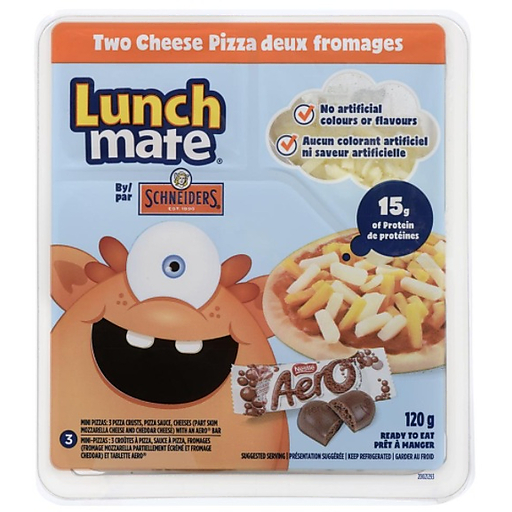Send your kids to school or day camp with a quick, ready-to-eat lunch with Schneiders® Lunch Mate® Two Cheese Pizza Kit. This lunch kit features three mini pizza crusts, part-skim mozzarella and cheddar cheeses, pizza sauce, and a mini Nestle Aero® Chocolate Bar for dessert. Each cheese pizza kit delivers 15 grams of protein and is made with no artificial colours or flavours. These delicious and convenient kits for kids are ideal for school, sports practice, picnics, or on-the-go snacks. Since 1890, Schneiders Foods has established a rich heritage of original and authentic recipes, using premium ingredients and taking all the time needed to honour the origin and inspiration of each recipe. Quality never gets old™.